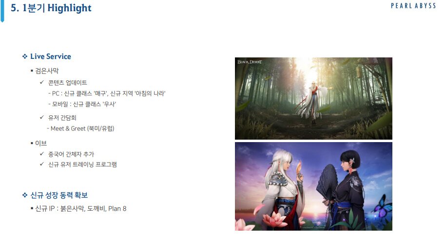 – ‘검은사막 모바일’ 신규 클래스 우사 출시, 1분기에도 글로벌 유저와의 접점 확대를 위한 이벤트 예정하고 있으며, 북미 이용자와 서비스 7주년 행사 진행 계획