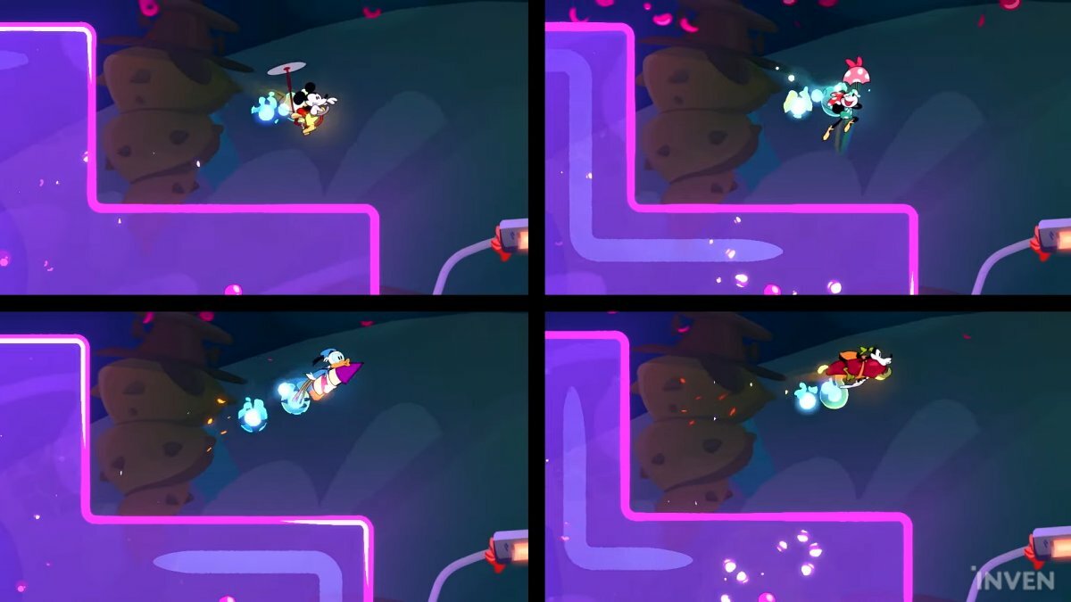이날 공개된 트레일러에서는 미키, 미니, 도날드 덕, 구피 등 플레이할 수 있는 4인의 캐릭터와 함께 각 캐릭터 특징을 살린 다양한 기술도 함께 살펴볼 수 있다. 도날드는 물 위에서 빠르게 헤엄치고 구피는 소스병을 짜내 활강하는 식. 여기에 이중 점프 시 미키는 꼬리를 프로펠러처럼 말아 돌리고, 미니는 작은 양산을 펼친다. 도날드는 작은 로켓을 안고 구피는 빨갛고 매운 할라피뇨를 타고 날아가는 등 같은 행동에서도 다른 애니메이션으로 개성을 살렸다.