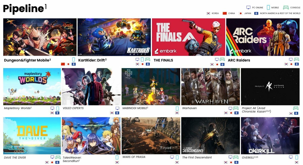 이 외에도 ‘더 파이널스’, ‘아크 레이더스’, ‘베일드 엑스퍼트’, ‘프로젝트 AK’, ‘테일즈위버 세컨드런’, ‘오버킬’, ‘메이플스토리 월드’와 얼리 액세스로 서비스 중인 ‘데이브 더 다이버’를 개발 파이프라인에 올려뒀다.