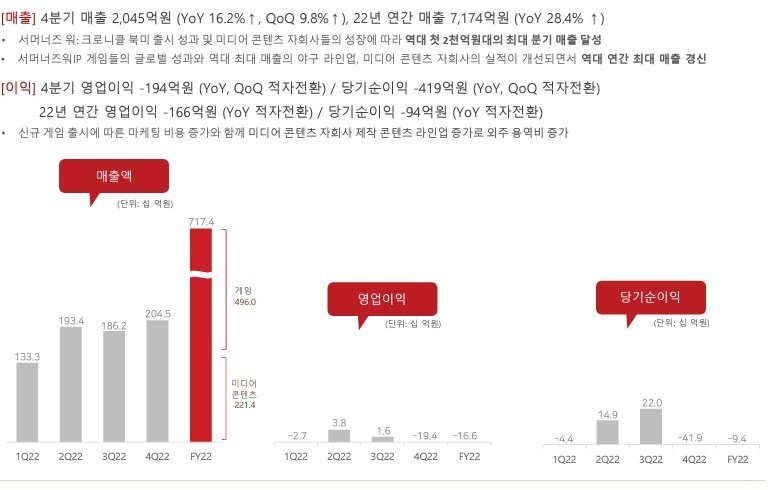 ㄴ서머너즈워 IP 게임들의 글로벌 성과와 역대 최대 매출의 야구라인업, 미디어 콘텐츠 자회사의 실적이 개선되면서 역대 연간 최대 매출 경신