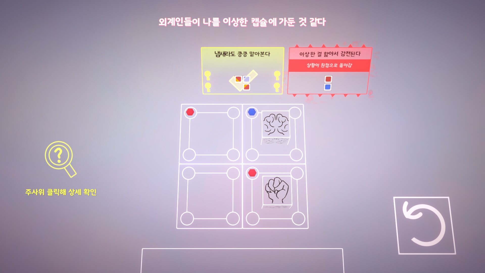 게임은 강아지가 다른 외계인과 의사소통을 하는 방법으로 ‘입에 문 주사위를 굴리는’, 꽤나 영리한 방법으로 풀어냈습니다. 간단하게 생각하면 주사위의 각 면에 특성 상황에 대한 선택지가 적혀있다면, 이를 굴려 나온 면으로 응답을 하는 것입니다. 주사위만큼 운의 요소가 강력히 작용하는 물건은 드물기에 때로는 원하지 않은 답변이 나올 수도 있지만, 그 때는 앞발로 되돌리기 버튼을 사용해 몇 번 재시도를 할 수도 있을 것입니다.