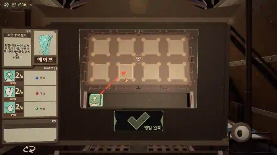 따라서, 리버의 여정에 합류한 모든 외계인 동료들은 게임 속에서 리버가 상호작용 할 수 있도록 ‘주사위’의 형태로 존재하게 됩니다. 그리고 이 주사위는 각 외계인들의 성격을 대변하는 만큼 특수한 능력을 가지고 있거나, 면마다 다른 형태의 ‘오오라’를 흩뿌리게 되어 있죠. 플레이어는 동료들의 주사위를 보드에 굴려 원하는 형태의 ‘오오라’를 생성해 주어신 상황 별 선택지를 고르게 됩니다.