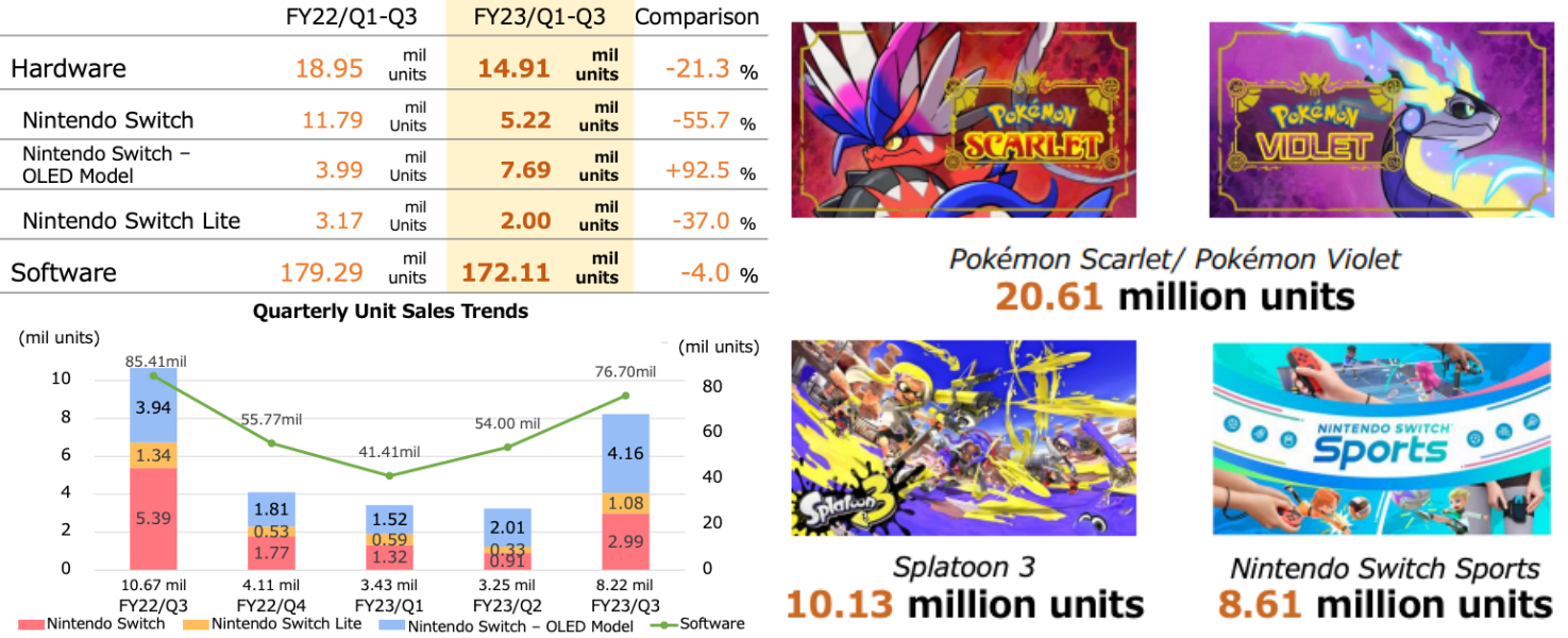 닌텐도가 포켓몬스터 스칼렛/바이올렛 2,000만 장, 스플래툰 1,000만 장 이상을 각각 출하하며 다시 한 번 소프트웨어 파워를 증명했다.