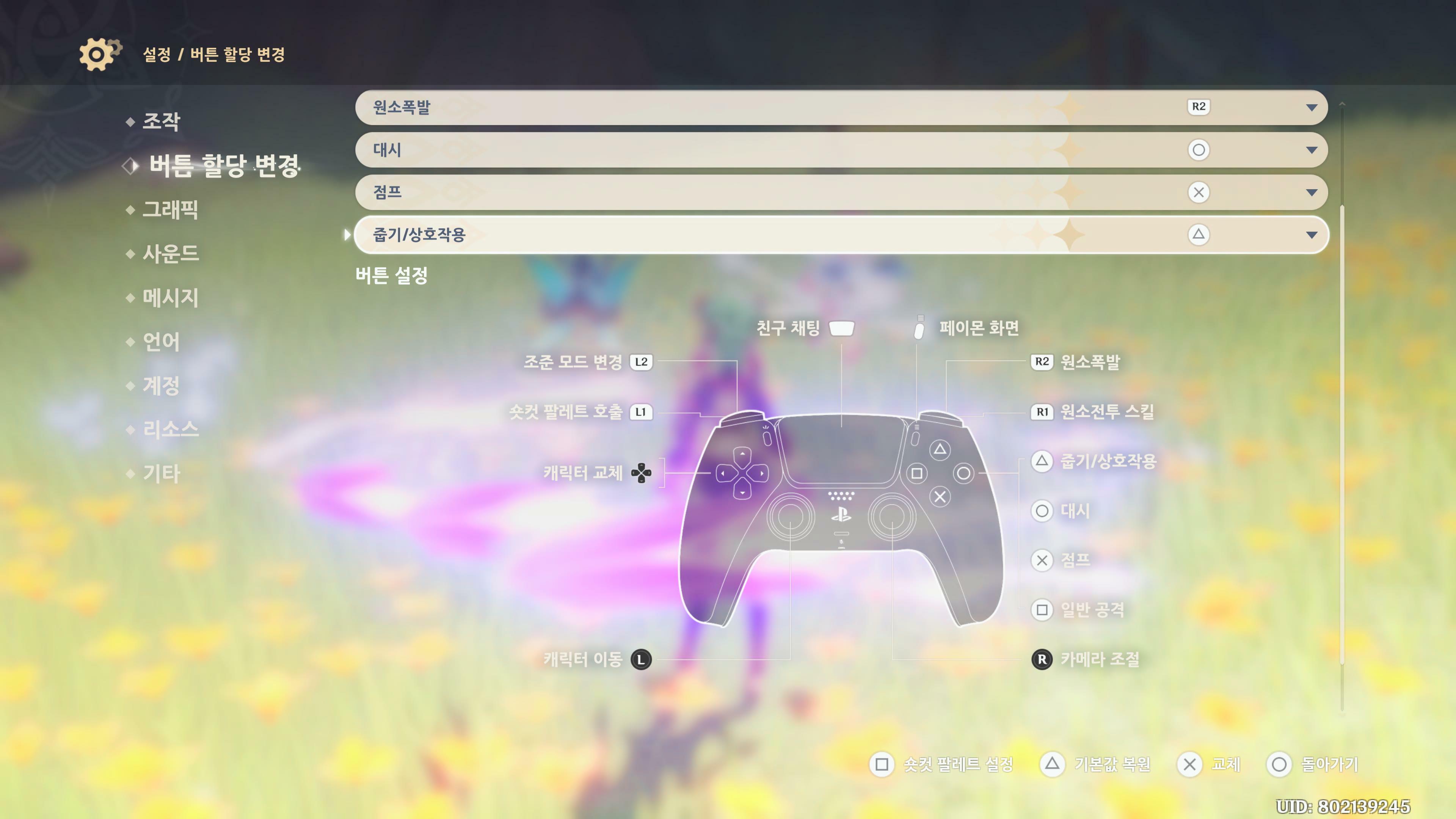 개인적으로는 PS5로 원신을 즐기는 데 가장 불편함을 느꼈던 요소가 바로 기본적인 버튼 매핑을 비롯한 조작감 문제가 가장 컸습니다. 메뉴 항목을 이동하는데 십자 패드가 아닌 왼쪽 스틱을 사용하는 것도 낯설었고, R1 버튼으로 달리기를 하거나, 평타와 궁극기 버튼이 너무 가깝게 붙어있는 등 여러모로 만족스러운 경험은 아니었기 때문입니다.