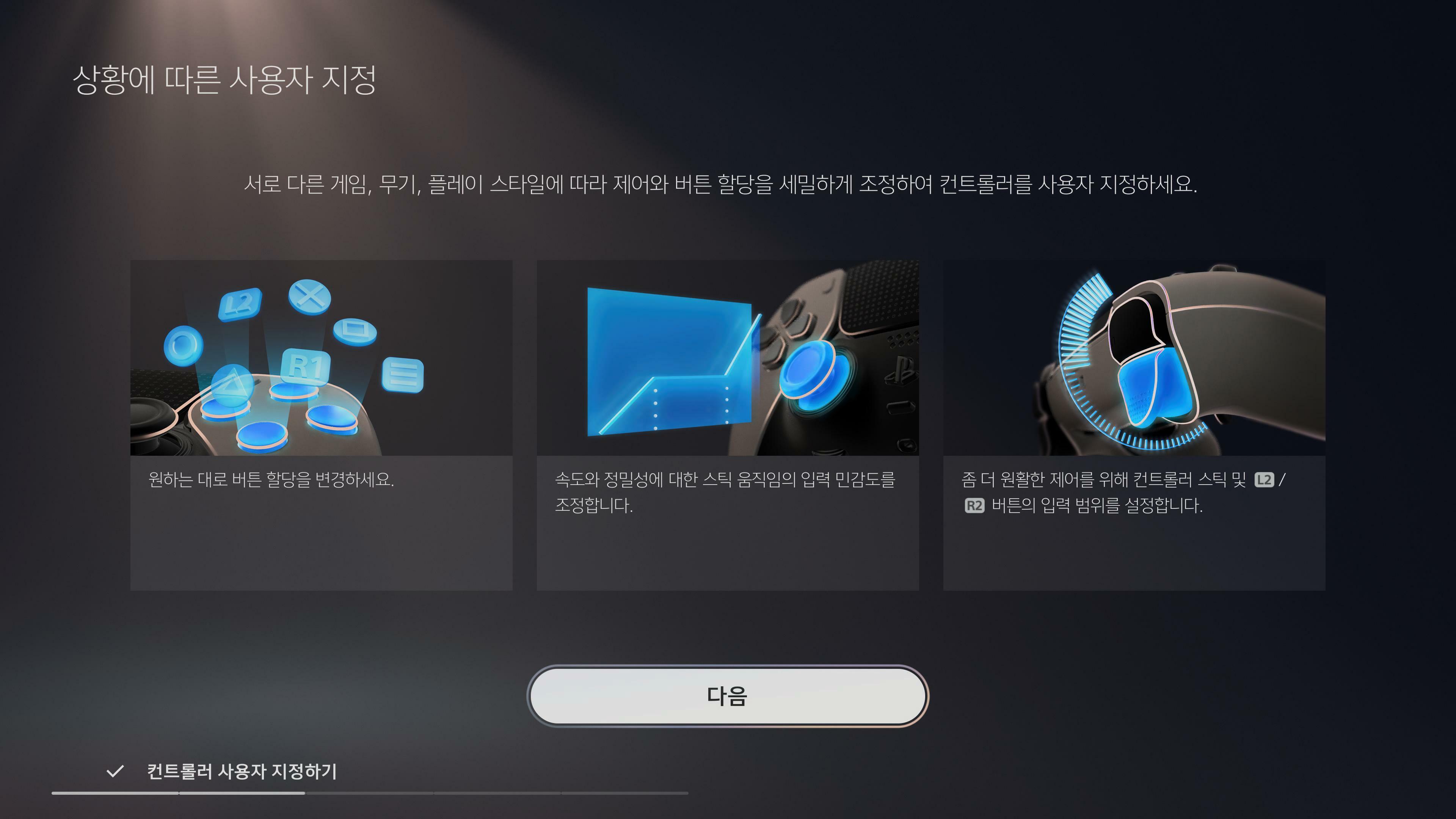‘듀얼센스 엣지’ 또한 기존 컨트롤러와 마찬가지로 최초 1회는 유선으로 연결하는 것이 원활한 인식에 도움이 됩니다. 콘솔 본체와 컨트롤러를 연결할 경우 곧바로 ‘듀얼센스 엣지’에 오신 것을 환영한다는 문구와 함께 간단한 튜토리얼이 시작되며, 이를 통해 듀얼센스 엣지가 제공하는 제품의 특징을 빠르게 습득할 수 있습니다.
