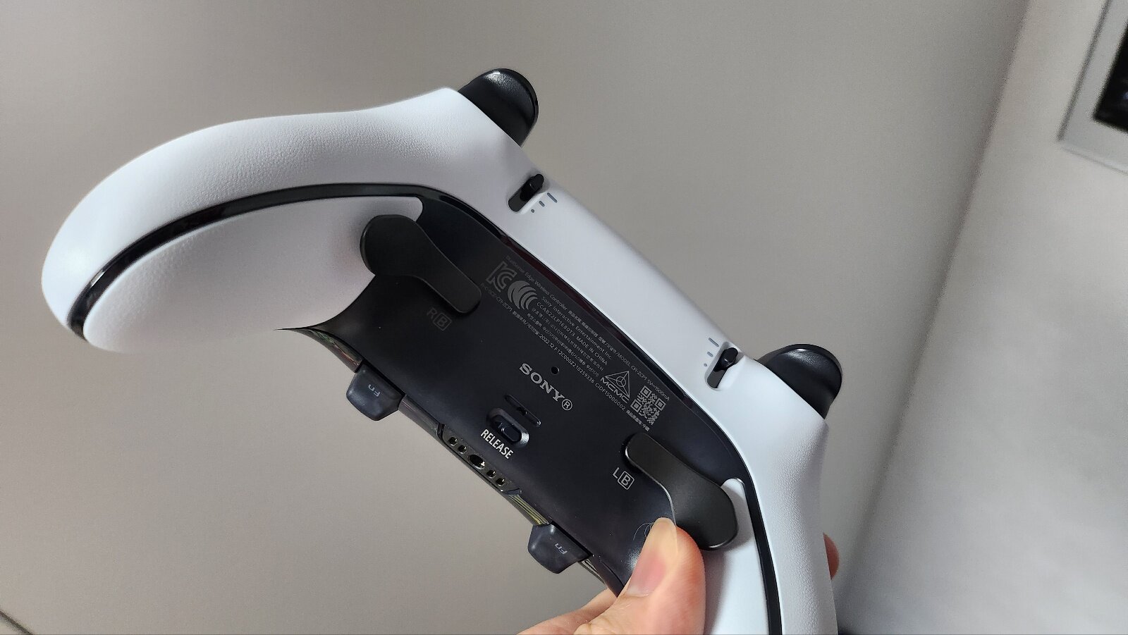 제품을 처음 손에 쥐었을 때 느낀 점은 손에 잡히는 느낌이 지금껏 잘 사용해 오던 일반 듀얼센스보다 아주 ‘약간’ 묵직하다는 것이었습니다. 크기나 형태는 기존 듀얼센스 그대로이지만, 교체 가능한 모듈들이 추가되면서 전체적인 무게에 변화가 생긴 것으로 보입니다.