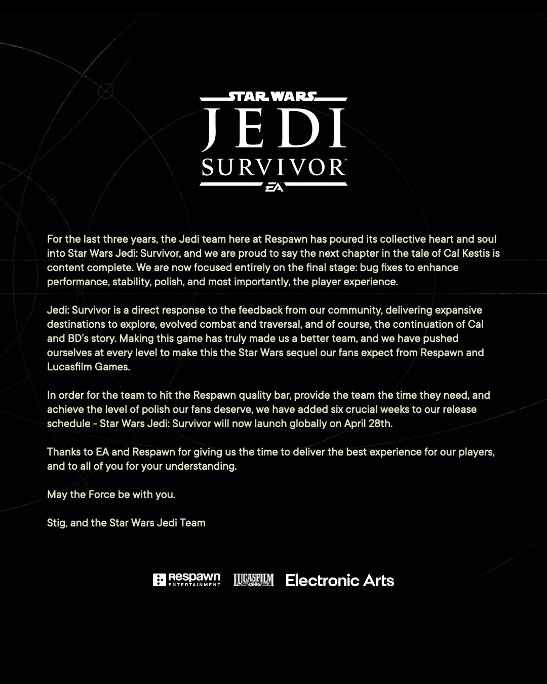 EA와 리스폰 엔터테인먼트는 금일(1일) 트위터를 통해 이같은 연기 소식을 발표했으며, “리스폰의 품질 기준에 도달하고, 팀에게 필요한 시간을 충분히 제공하며, 팬들이 마땅이 받아야 할 폴리싱 수준에 도달하기 위해서” 이번 출시 연기를 결정하게 된 경위를 설명했다.