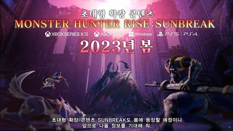 추가로 1월 20일부터 발매된 XBOX 시리즈 X|S, XBOX ONE, Windows, PS5, PS4의 초대형 확장팩 콘텐츠 선브레이크 역시 2023년 봄으로 발표되었으며, 신규 몬스터 이베르카나의 가루크 덧입기는 응모자 한정 선행 배포가 결정됐다.