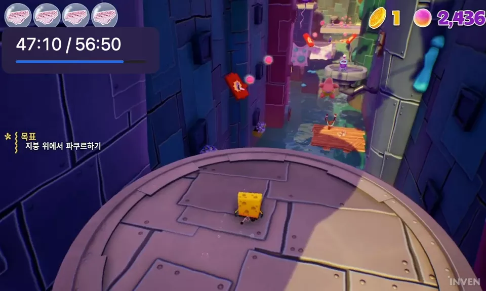 어른이가 보면서 마음껏 웃어도 되는 타이틀이 스폰지밥이라는 걸 생각하면 지나치게 낮은 난이도 역시 아쉬운 부분으로 꼽을 만합니다. 간단한 2단 점프, 완전 사망 없는 넉넉한 체력 회복과 부활, 단순한 공격 패턴 등 심하게는 지루하다 싶을 정도의 액션을 구현하고 있습니다.