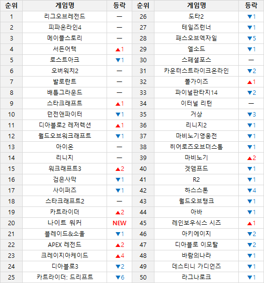 ■ 인벤 순위 – 간만에 등장한 액션 신작, ‘나이트 워커’ 20위로 쾌조의 출발