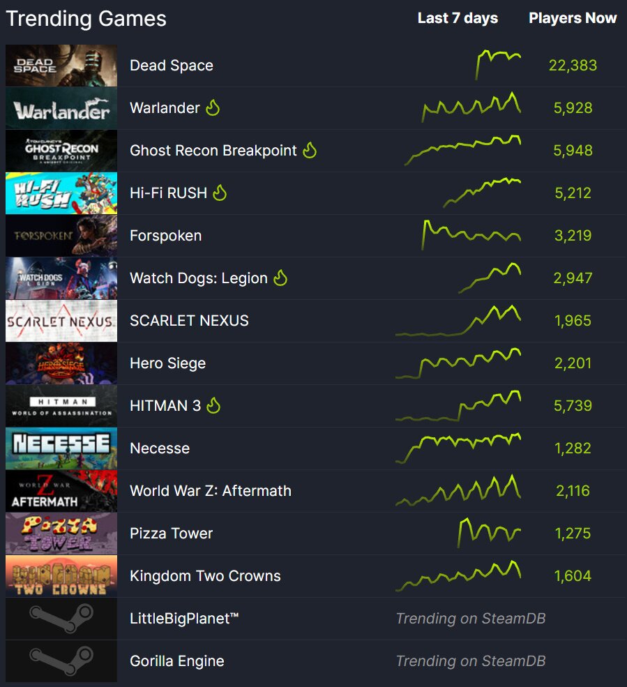 – 지난 주말, 해외 외신들의 호평 속에서 정식 출시된 리메이크 버전 ‘데드 스페이스’가 스팀 트렌드 지표의 최상단에 위치했습니다. 이용자 폭이 제한되는 호러 장르이기에 최다 동시 접속자는 3만여 명 가량에 그쳤지만, 대다수 이용자들의 호평이 이어지고 있습니다. 특히, 15년 전 원작에서 어긋나지 않게 변화를 준 디테일들이 좋은 인상을 주고 있으며, 랜덤하게 등장하는 괴물들은 원작 플레이어도 예상하지 못한 곳에서 놀람을 선사하기도 합니다.