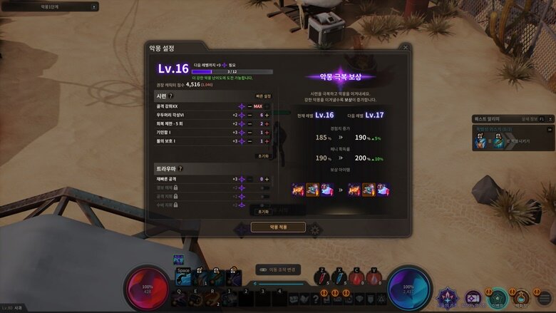 이러한 난이도 요소들은 ‘시련’과 ‘트라우마’라는 카테고리로 구분된다. ‘시련’에 해당하는 요소들은 ‘캐릭터 점수’에 따라 설정 가능한 최대치가 정해져 플레이 불가능한 난이도를 설정하는 부작용을 방지하고자 했다. ‘트라우마’에 해당하는 요소들은 ‘캐릭터 점수’와는 무관하게 설정이 가능하지만 플레이 기록에 따라 각 요소가 해금되는 형식으로, 점진적인 난이도 체험이 가능하다. 액션에 대한 이해도가 높은 한국 유저의 특성에 맞게 유저가 직접 선택해 자신의 취향을 게임에 반영시켜 개인화된 경험을 할 수 있도록 준비했다.