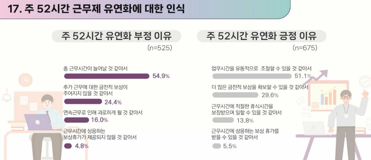 주 52시간 근무제 유연화에 대해서는 긍정적이라고 응답한 종사자가 56.3%, 부정적이라고 응답한 종사자가 43.7%로 긍정적인 의견이 상대적으로 높았다. 다만, 유연화에 따라 이어질 변화에 대한 다른 시각이 존재했다.