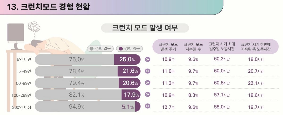 아울러 규모가 작은 곳일수록 크런치 경험도 많았으며 300인 이상 사업체 소속 종사자들은 타 규모 사업체보다 크게 낮은 5.1%만이 크런치 모드를 경험했다.