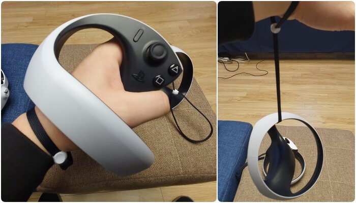 처음 손에 쥐어본 PS VR2의 센스 컨트롤러에서도 여러 사용자 편의 기능을 찾아볼 수 있었다. 양쪽 컨트롤러엔 PS 버튼을 시작으로 PS 컨트롤러의 상징이라고 할 수 있는 네 개의 액션 버튼, 아날로그 스틱, R1, R2, L1, L2 트리거까지 다양한 버튼이 적용되어 듀얼센스 수준의 정교한 조작이 가능할 것으로 기대됐다.