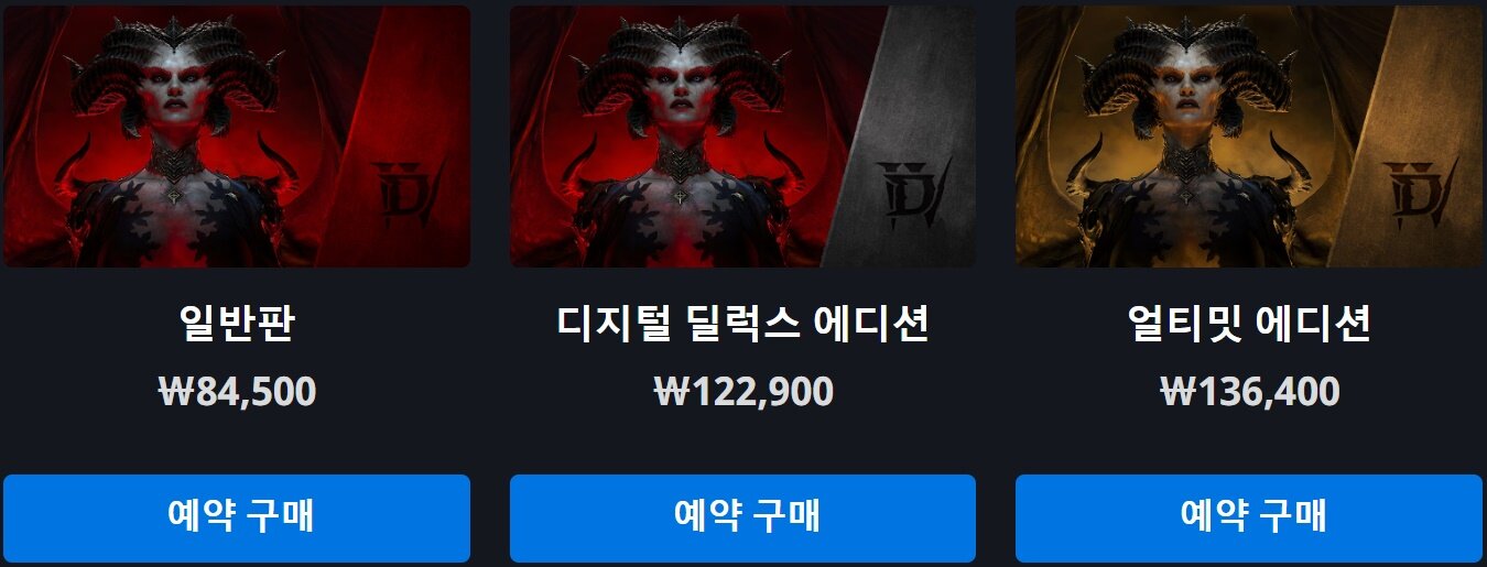 딜럭스 에디션(Deluxe Edition) : 일반판의 모든 콘텐츠에 더해 디아블로® IV 출시에 앞선 최대 4일의 얼리 액세스, 디아블로® IV에서 제공되는 시즌 배틀 패스 잠금해제, 디아블로® IV에서 사용 가능한 지옥벼림 갑각 탈것 방어구 및 유혹 탈것 포함