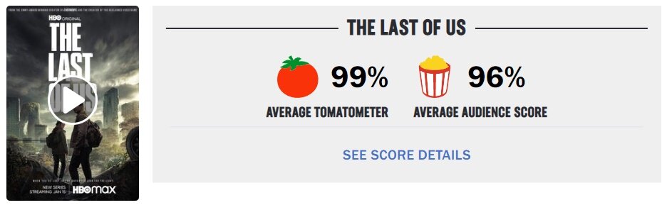 지난 15일 방영한 ‘라스트 오브 어스’ 1화는 현재 IMDB 유저 평가 9.3점을 기록 중이다. IMDB에서 드라마 가운데 역대 최고 평가를 기록한 ‘브레이킹 배드’가 유저 평가 9.5점인 것을 고려하면 상당히 높은 평가를 받았다고 할 수 있다. 로튼 토마토에서도 긍정적인 반응이 이어지고 있다. 평론가를 대상으로 한 신선도 지수의 경우 99%를, 유저(관객)가 평가하는 팝콘 지수는 96%를 기록하면서 흥행과 비평 모두를 거머쥔 모습이다.