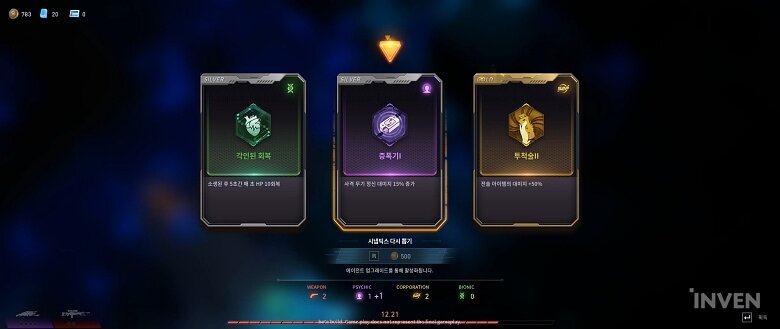 마지막 세 번째는 시냅틱스라 불리는 카드를 선택하거나 돈으로 장비를 구매하는 방식이다. 시냅틱스는 일회성 강화 아이템으로 웨폰, 사이킥, 코퍼레이션, 바이오닉으로 구분되는 카드를 선택해서 캐릭터의 능력치를 상승시킬 수 있다.