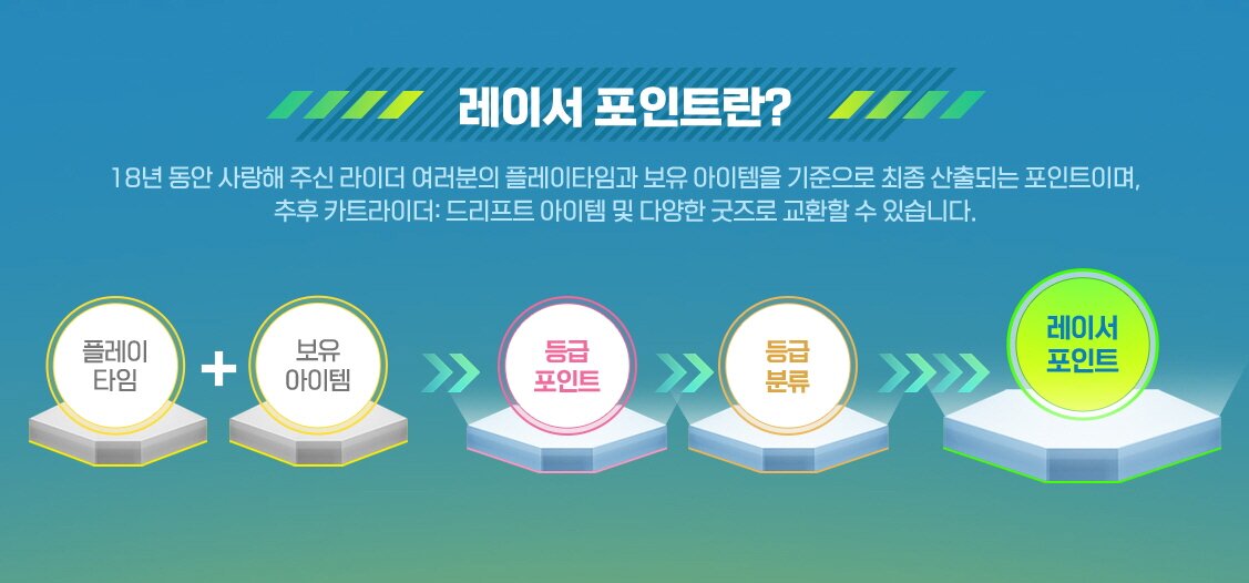이렇게 주어지는 레이서 포인트는 오는 3월 중 열리는 카트라이더 드림 상점에서 사용 가능하며, ‘카트라이더: 드리프트’에서 사용할 수 있는 카트바디 등 아이템으로 교환하거나 ‘카트라이더’ IP의 아이덴티티가 담긴 실물 굿즈를 소장하는 것이 가능하다. 추가로, 레이서 포인트 전환 신청을 완료한 유저들에게는 ‘카트라이더: 드리프트’에서 사용할 수 있는 카트바디 1종과 번호판 1종, 캐릭터 1종, 스티커 3종으로 구성된 헌정 패키지 또한 제공하여 원작에서의 추억을 후속작에서도 이어갈 수 있게 마련한다.
