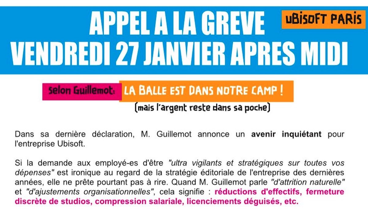 IT 연대는 17일 불문, 영문으로 된 성명문을 게시하며 1월 27일 오후, 기예모 대표에 대한 파업을 유비소프트 파리 직원들에게 요청했다. IT 연대는 최근 유비소프트가 회사 미래에 관해 발표하며 직원들에게 요구한 발언을 문제 삼았다.