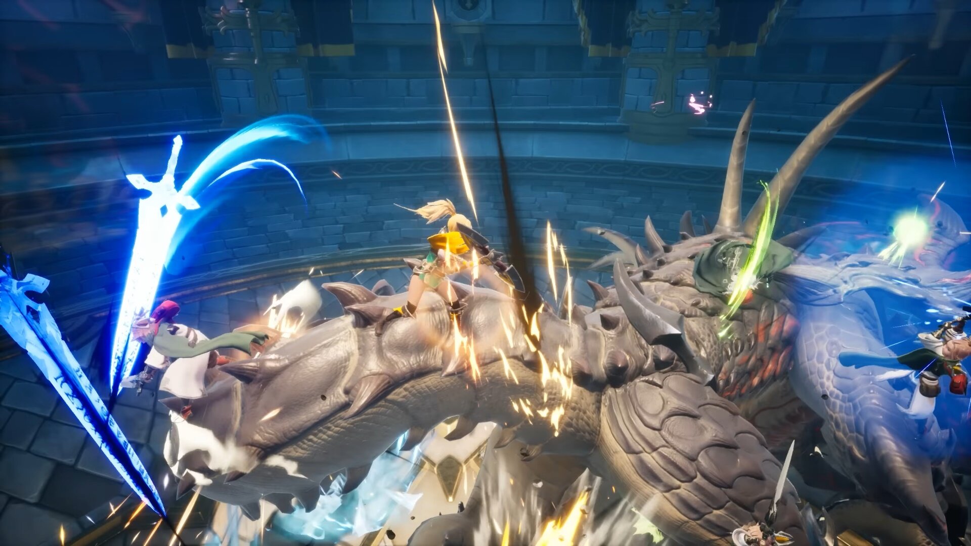 플레이어들이 힘을 합쳐 다양한 상태이상 효과를 일으킬 수 있고, 상태이상에 빠진 몬스터에 다 같이 올라타 넘어트려 넉다운 상태로 만들 수 있습니다. 거대 몬스터가 넉다운 상태가 되면, 각 캐릭터마다의 고유한 필살기로 이어지도록 연계하여 토벌하는 것을 거대 보스전의 중요한 액션 매커니즘으로 고안하였습니다.