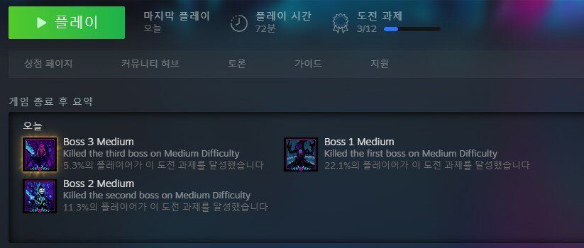 론 루인을 플레이할 때 가장 아쉽게 느껴졌던 부분은 반복 플레이를 통한 성장 요소의 부재입니다. 론 루인에서는 회차 플레이를 아무리 여러 차례 반복하더라도 일정량의 경험치나 재화가 다음 플레이로 연계되지 않습니다. 그저 각 플레이 당시의 기록을 수치로 전환하여 하이 스코어를 매기고, 이를 리더보드에 기록하여 다른 유저들과 순위 경쟁을 할 수 있을 뿐이죠. 로그라이트가 아닌 로그라이크를 표방하고 있는 만큼 감수해야 하는 부분이기도 하지만, 끊임 없는 반복 플레이를 통한 성장 요소를 기대했던 몇몇 유저들에게는 아쉬울 수 있는 부분입니다.