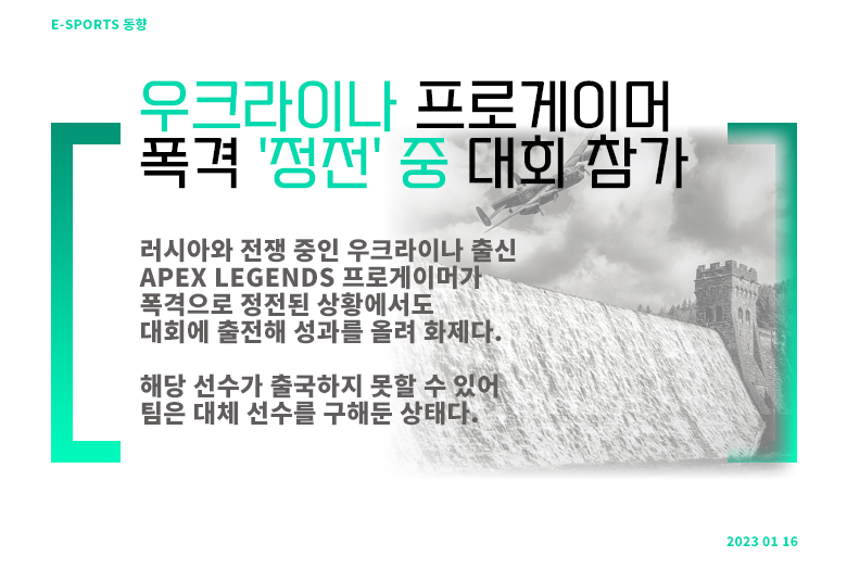 – 우크라이나가 여전히 러시아와의 전쟁을 이어가고 있는 중에 한 에이펙스 레전드 프로게이머가 역경을 딛고 팀과 함께 ALGS LAN 진출에 성공했다. 이 소식은 SNS를 통해 빠르게 전파됐다. 소식의 주인공은 ‘MaxStrafe’라는 닉네임의 우크라이나 프로게이머다. 그는 러시아의 폭격으로 정전이 된 도시에서 이웃의 발전기를 빌려 에이펙스 레전드를 실행, 팀과 함께 경기를 치렀고 대회 진출 자격을 얻었다. 하지만 정작 ‘MaxStrafe’는 우크라이나 사정상 출국이 어려워 대회에 참가하지 못할 수도 있다. 그가 속한 팀은 만약을 대비해 대체 선수를 구해둔 상태다.