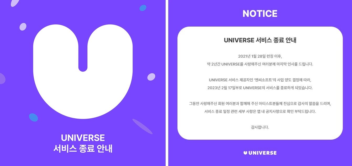 엔씨소프트(이하 엔씨)가 직접 개발, 운영하는 글로벌 K POP 팬덤 플랫폼 ‘유니버스(UNIVERSE)’가 다가오는 2월 17일을 끝으로 모든 서비스를 종료한다.
