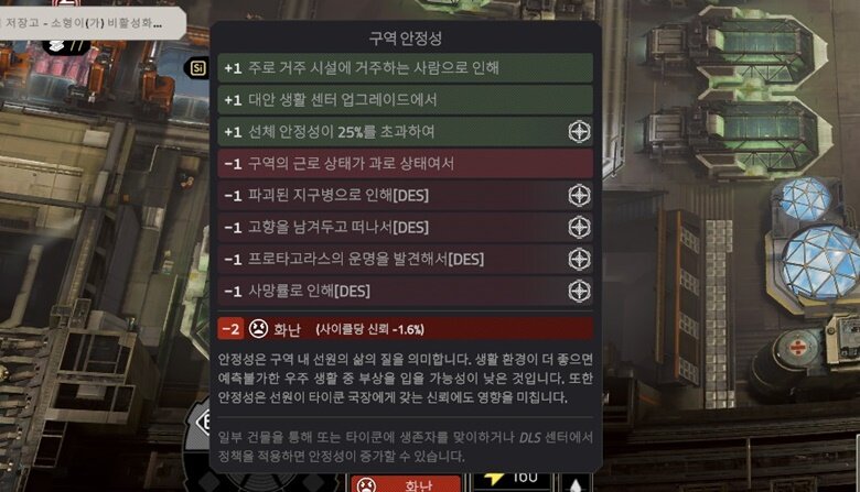 이 와중에 신경을 쓰며 관리해야 하는 부분도 있습니다. 거주민들이 너무 과하게 일하지 않도록 시설 확충 속도를 조절해야 하고, 퀀텀 점프때문에 정거장이 너덜거린다는 설정이 있기 때문에 EVA 도크를 충분히 배치해 꾸준히 정거장을 수리해줘야 합니다. 이런 서바이벌 경영물의 단골인 ‘딜레마’도 꾸준히 등장하는데, 정거장을 이끄는 리더로서 언행을 신중히 해야 하죠. 지키지도 못할 공약을 남발했다간 신뢰도가 퍽퍽 날아갑니다.