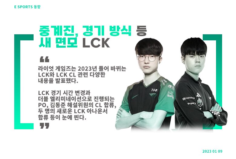– 2023 LCK 스프링 스플릿이 오는 18일 개막한다. 라이엇 게임즈는 2023년 들어 바뀌는 LCK와 LCK CL 관련 다양한 내용을 발표했다. 먼저, LCK 경기 시간은 기존에 공지됐던 바와 같이 평일 17시와 19시 30분, 주말 15시와 17시 30분으로 바뀌었다. 플레이오프에는 더블 엘리미네이션 방식이 적용된다.