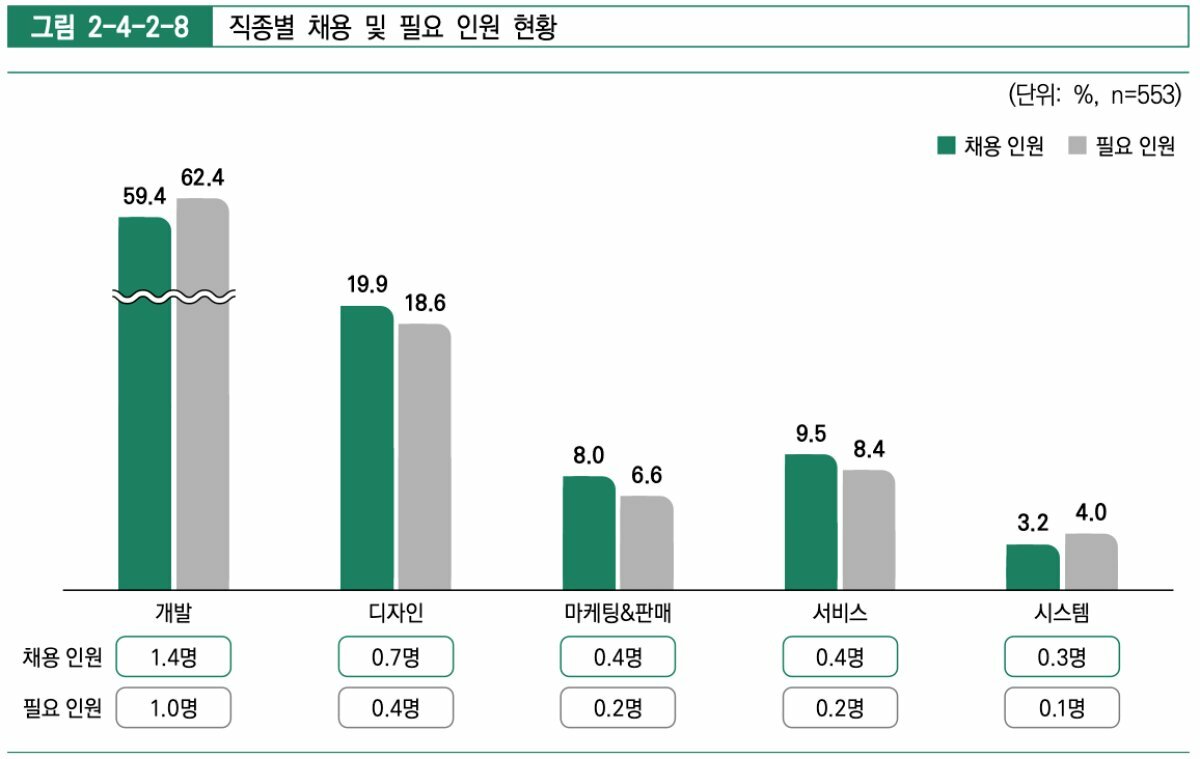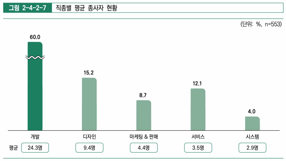 개발, 디자인, 마케팅&판매, 서비스, 시스템 등 직종별 종사자 중 가장 높은 비율을 차지한 건 개발 부문이었다. 게임 PD, 게임 개발 및 기획, 서버 및 클라이언트 개발, 게임 사운드, 동영상, 테크니컬 아티스트(Technical Artist, TA), 품질 관리(Quality Assurance, QA), 엔진 개발 등과 관련된 업무 비율은 60%였다. 종사자 규모가 큰 회사일수록 개발 비율 대비 디자인 비율이 늘어나는 모습을 보였다.