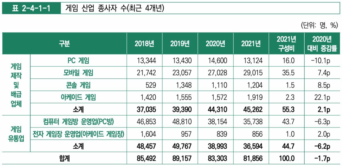 전체적인 게임 제작, 배급 업체 종사자 수는 2020년 대비 2.1% 증가했지만, 종목별로 보면 큰 차이를 보였다. 모바일 게임 관련 종사자는 1,987명 증가했지만, PC 게임 제작 인원은 1,476명이 줄었다. 아케이드 게임 종사자는 전체 구성비가 적어 347명 증가했지만, 이는 전년 대비 22.1% 증가한 수치기도 하다.