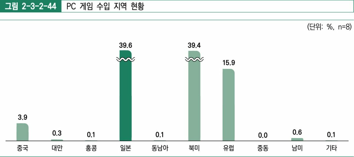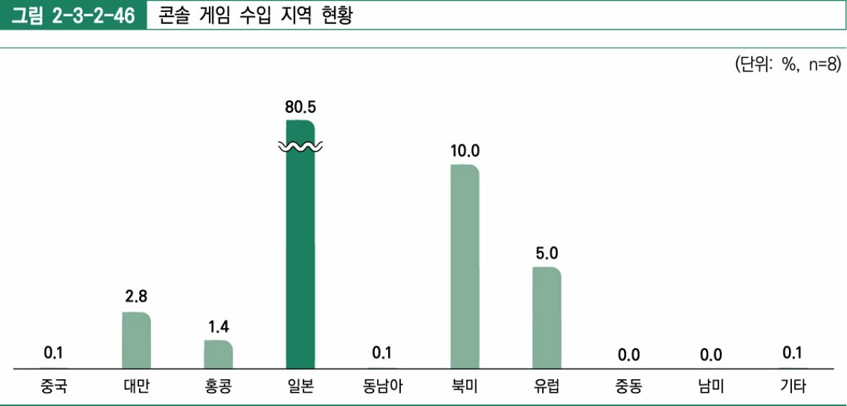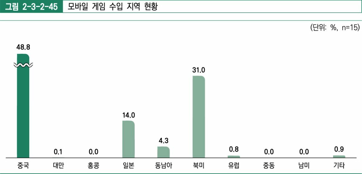수입에서는 플랫폼별로 뚜렷한 지역 차이가 드러났다. PC 게임의 경우 일본, 북미, 유럽 등에서 고르게 게임을 수입한 것과 달리 모바일 게임은 중국, 콘솔 게임은 일본 비중이 각각 48.8%, 80.5%로 압도적으로 높았다.
