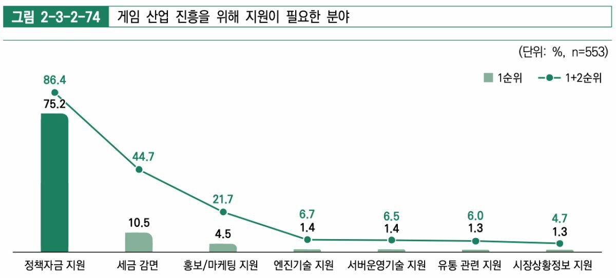 이 외에도 게임 산업 진흥을 위해 가장 필요한 분야로는 정책자금 지원이 꼽혔다. 75.2%의 응답자가 게임 산업 진행에 중요한 분야로 이를 꼽았고 세금 감면 역시 필요하다고 밝혔다.
