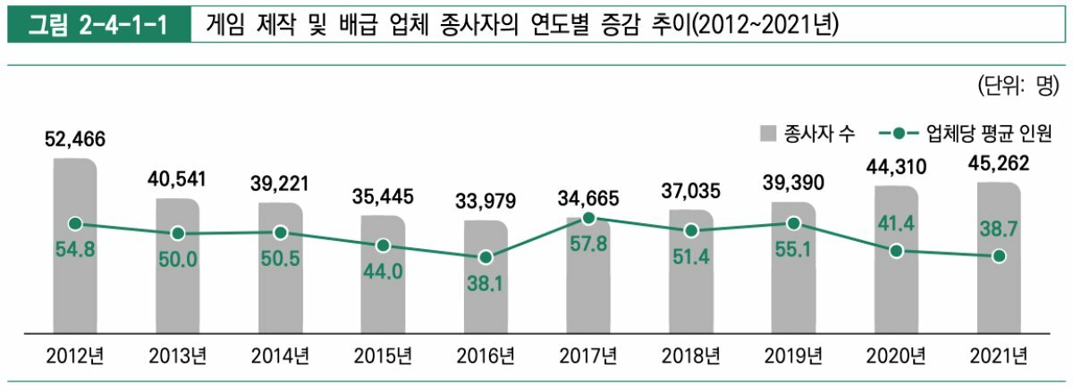 2021년 국내 게임 산업 총 종사자는 81,856명으로 나타났다. 이 중 게임 제작, 배급 업체에 종사하는 인원이 45,262명으로 전체 종사자의 55.3%를 기록했다. 나머지 36,594명은 PC방, 아케이드 게임장 등 게임 유통업체에 종사하는 것으로 나타났다.