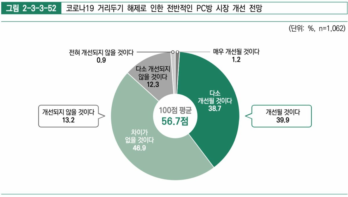 이에 코로나19로 인해 가장 큰 피해 이유였던 거리두기가 해제된 후 PC방 시장 개선 전망도 개선될 것이라는 전망이 39.9%로 높게 나타났다.