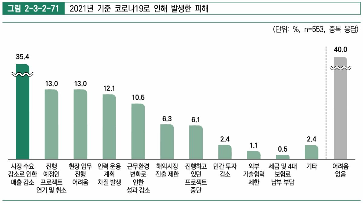 가장 큰 피해로는 시장 수요 감소로 인한 매출 감소가 꼽혔다. 여기에 진행 예정인 프로젝트의 연기 및 취소, 현장 업무 진행 어려움, 인력 운용 계획 차질, 근무 환경의 변화로 인한 성과 감소 등이 큰 영향을 준 피해로 조사됐다.