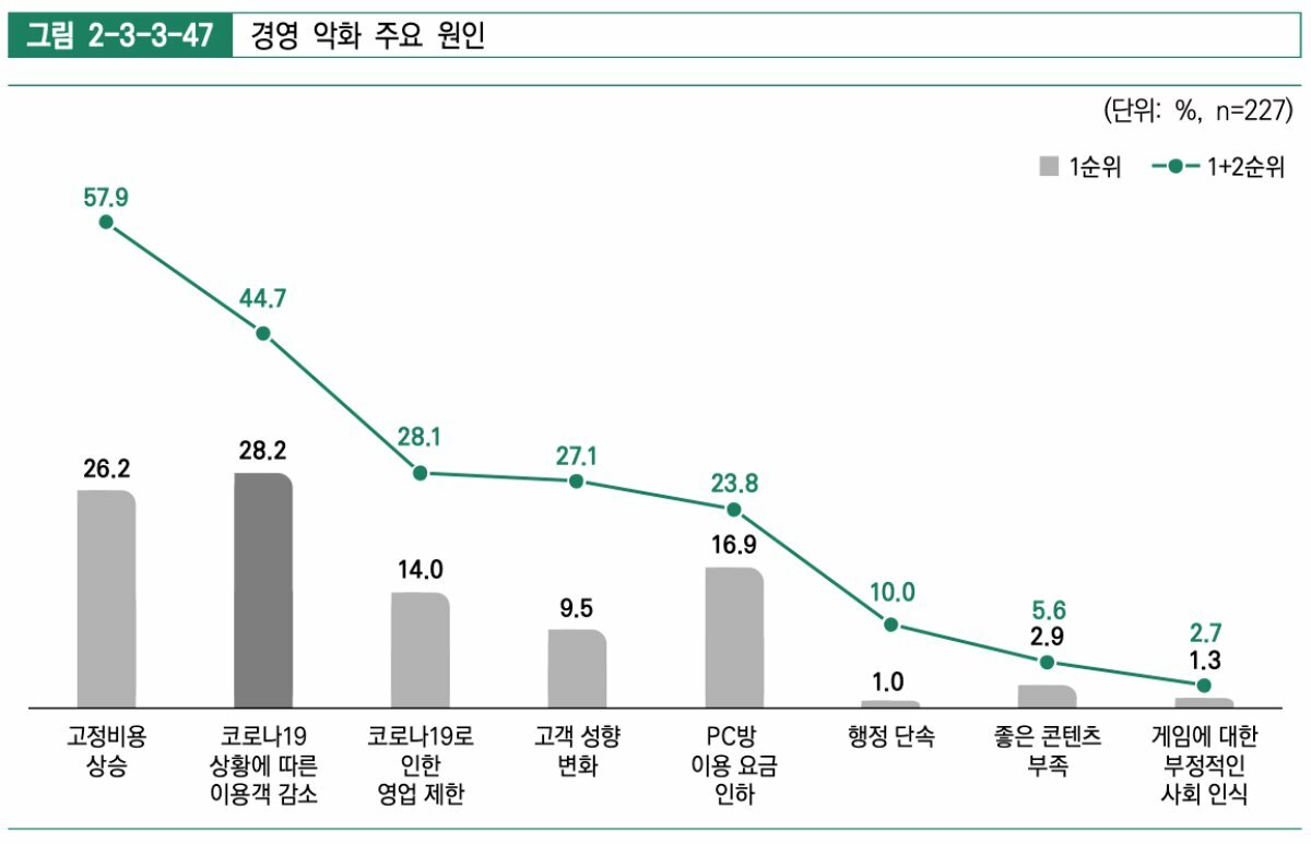 이미 코로나19로 인한 영향이 커졌던 만큼 2021년 체감 경영 상황에 대해서는 차이가 없다는 의견이 54.5%로 가장 높았다. 하지만 코로나19에 따른 이용객 감소와 영업 제한은 응답자의 42.2%가 경영 악화의 가장 큰 원인으로 꼽았다. 코로나19 외에도 고정 비용 상승이 26.2%, PC방 이용 요금 인하가 16.9%로 경영 악화 배경으로 지목됐다. 특히 코로나19 장기화에 따른 이용객 감소는 향후 경기 전망 악화 이유로도 꼽히며 업체의 고민을 알 수 있는 대목이다.
