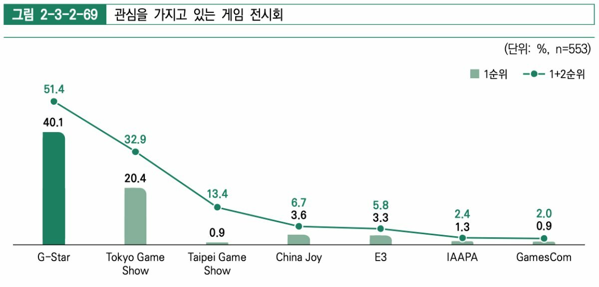 26.2%를 제외한 업체가 현재 게임 전시회 참여에 관심을 가지고 있다고 전했다. 지스타 참가를 가장 우선시하는 업체가 40.1%인 가운데 도쿄 게임쇼에 관심을 가지고 있다고 응답한 업체도 20.4%에 달했다. 특히 타이베이 게임쇼는 1순위 응답자는 0.9%에 그쳤지만, 2순위를 더한 응답자는 13.4%로 세 번째로 관심 있는 게임 전시회로 꼽혔다. 반면 E3, 게임스컴 등 서구권 전통의 게임 전시회의 관심도는 비교적 낮았다.