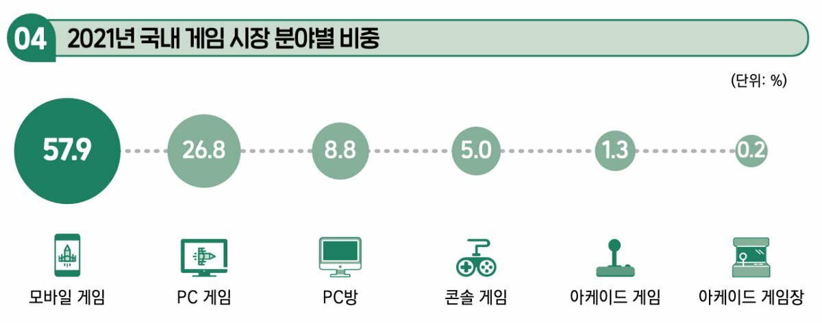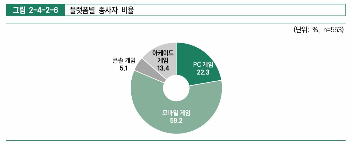 이러한 높은 모바일 비중은 플랫폼별 매출 비중에서도 확인할 수 있다. 모바일 게임은 58.8%로 전체 매출의 과반수를 차지하였으며 PC 게임 22.6%, 아케이드 게임 13.2%, 콘솔 게임 5.3% 순으로 나타났다. 아케이드 게임은 5인 미만의 업체에서의 매출 비중이 높았고 PC 게임은 100인 이상의 대형 업체에서 비중이 높게 조사됐다. 모바일 마켓의 매출 비중은 양대 플랫폼으로 꼽히는 구글 플레이, 애플 앱스토어가 90% 이상의 점유율을 가졌으며 그중에서도 구글 플레이가 65.9%의 매출 비중을 차지했다.
