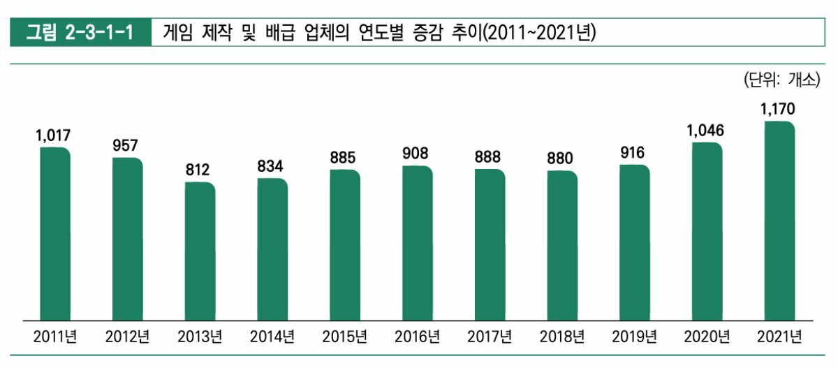 한국콘텐츠진흥원은 ‘2022년 대한민국 게임백서’를 발간, 2021년 국내외 게임 시장의 추이를 조사, 발표했다. 2021년은 게임 산업 규모가 20조 원을 돌파 전년 대비 11.2% 성장했고 게임 제작 업체도 1,100개를 넘어섰다.