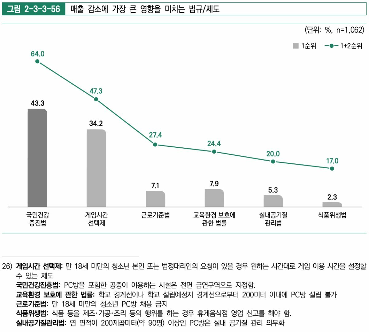 한편, 업체들은 매출 감소에 가장 큰 영향을 미치는 법규나 제도로 국민건강증진법이 가장 높게 나타났다. 해당 법규는 PC방을 전면 금연 구역으로 지정하는 내용으로 업체가 이를 통해 성인 이용자 감소에 영향을 미쳤다고 판단하고 있음을 알 수 있다. 게임시간 선택제 역시 34.2%로 매출 감소 이유로 꼽혔다.