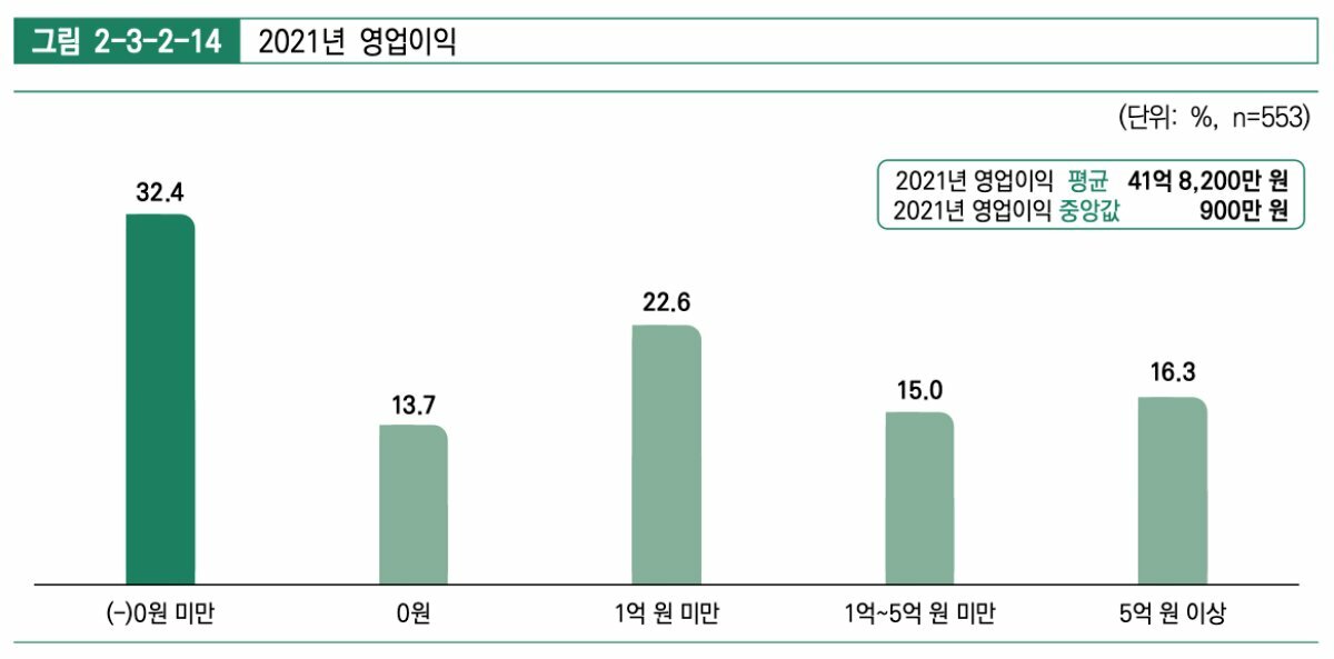 에 맞춰 평균 매출액도 지난 2020년 198억 3,800만원보다 상승한 266억 1,900만 원으로 조사됐다. 특히 10억~50억 원 미만 매출을 기록한 업체가 22.4%로 가장 많았다. 하지만 흑자를 보지 못한 기업은 많다. 2021년 영업이익은 41억 8,200만 원이었으나 전체 업체의 32.4%가 ‘0원 미만’의 영업이익을 기록하며 가장 높은 비중을 차지했다.