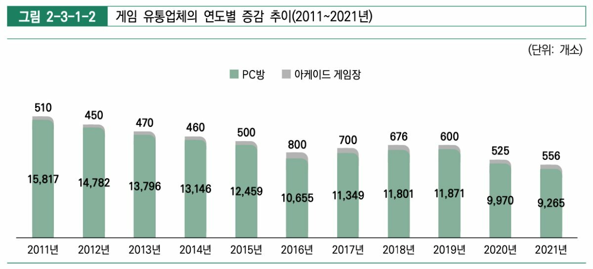 대표적인 게임 유통 업체인 PC방은 코로나19 영향을 직접적으로 받은 게 여러 수치로 드러났다. 2009년 21,547개에 달하던 PC방은 꾸준히 감소해 2021년 9,265개로 줄었다. 2016년 이후 조금씩 증가하던 추세도 2020년 코로나19 발생 이후 1만 개 밑으로 줄었고 2021년에도 전년 대비 7.1%가 줄었다.