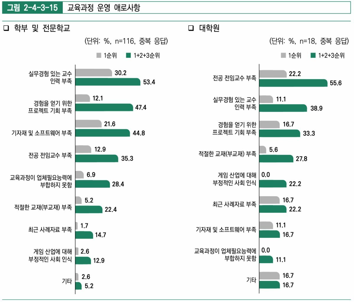학부 및 전문학교에서 게임 업쳬 개발 경력을 가진 비율이 33.8%, 비게임 개발 업체 경력 비율이 36%를 기록했지만, 실무 경험에 대한 갈증은 남아있는 셈이다. 소프트웨어, 하드웨어를 포함한 2021년 기자재 확충 및 보완이 이루어진 곳도 32.8%에 불과했다.