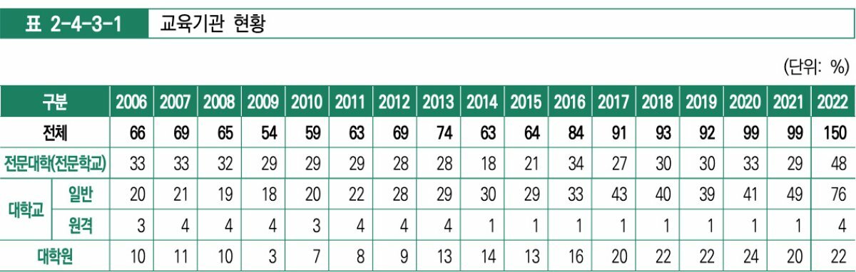 2022년 전국 게임 관련 교육기관은 150개로 2021년 99개에서 큰 폭으로 증가했다. 이는 게임 산업의 규모 증가, 중요성 대두에 따른 수요 증가가 실질적인 교육기관 증가로 이어진 셈이다.