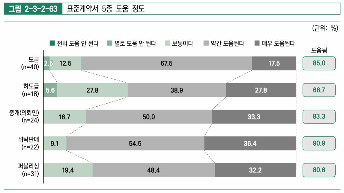 지난 2018년 문화체육관광부와 과학기술정보통신부가 공동으로 마련한 ‘게임 표준계약서’ 5종에 관해서는 이를 알지 못하는 사업체가 더 많았다. 조사 대상 중 17%만이 게임 표준계약서 5종 마련 사실을 인지하고 있었다. 또한, 이를 인지한 사업체 중에서도 실제로 활용했다 응답한 비율은 도급, 하도급, 중개, 위탁판매, 퍼블리싱 모두 50%를 넘기지 않았다.
