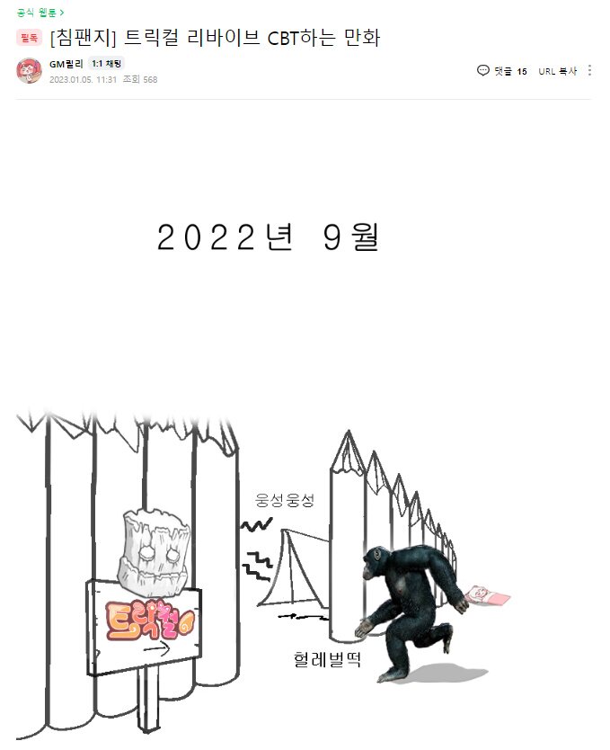 에피드게임즈는 오늘(5일), 공식 카페에 CBT 일정을 알리는 공식 웹툰 ‘[침팬지] 트릭컬 리바이브 CBT 하는 만화’를 게재했다. 해당 웹툰은 에피드게임즈가 가디언테일즈 갤러리에서 ‘근데 이제 뭐함’, ‘소신발언’, ‘갈!!!!!’, ‘이대로만 갑시다’ 등 밈을 담은 작품을 창작한 유저와 직접 컨택한 뒤, 해당 유저가 트릭컬의 상황에 맞춰서 재생산해낸 작품이다.