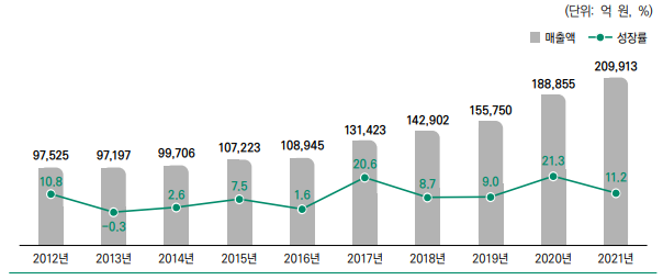 한국콘텐츠진흥원(원장 조현래)가 발간한 ‘2022년 대한민국 게임백서’에 따르면 2021년 국내 게임 시장 규모는 20조 9,913억 원이다. 집계 이후 최초로 시장 규모 20조 원을 돌파했다. 전년 대비 11.2% 증가했다. 국내 게임 산업은 2013년 0.3% 감소 이후 10년 동안 꾸준히 성장세를 기록했다. 2020년 코로나19 영향으로 시장 규모가 20% 이상 성장하였는데, 2021년에도 11.2% 커지는 성과를 거뒀다.