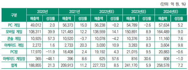 PC 게임 시장 규모는 전년 대비 0.2% 감소할 것으로 예측됐다. PC 게임은 신작 출시가 예정되어 있기는 하나, 매출액이 시장에 반영되기까지 시간적 차이를 고려해야 하고, 2021년에 큰 폭으로 성장했기 때문이다.